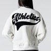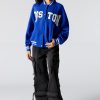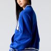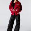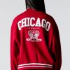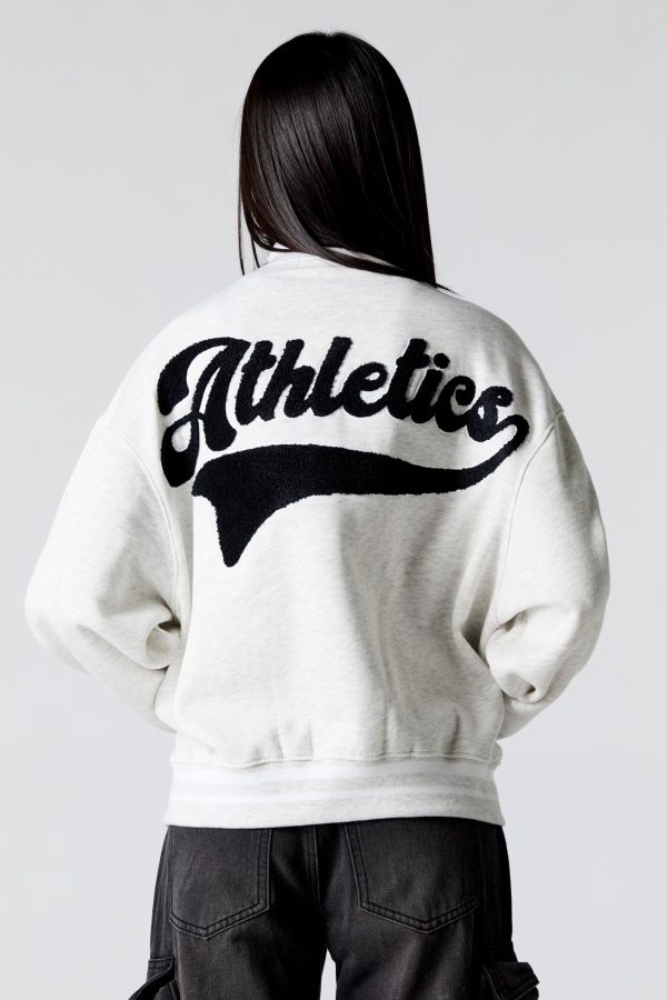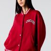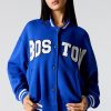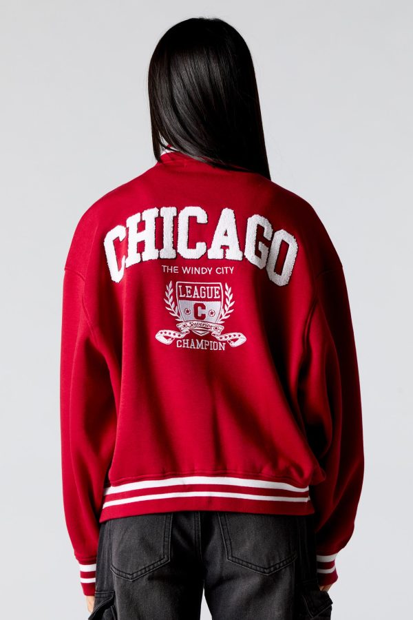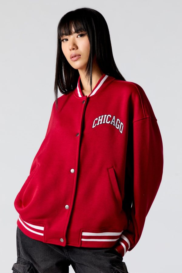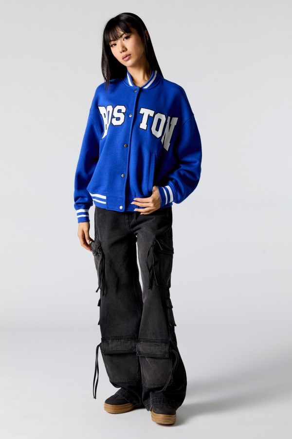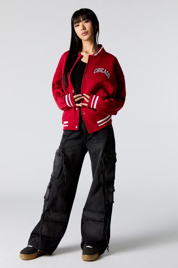 This varsity jacket features fleece material, embroidery, flat collar, snap button front, pockets, long sleeves, cinched cuffs, and striped ribbed knit trim.