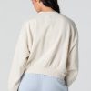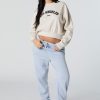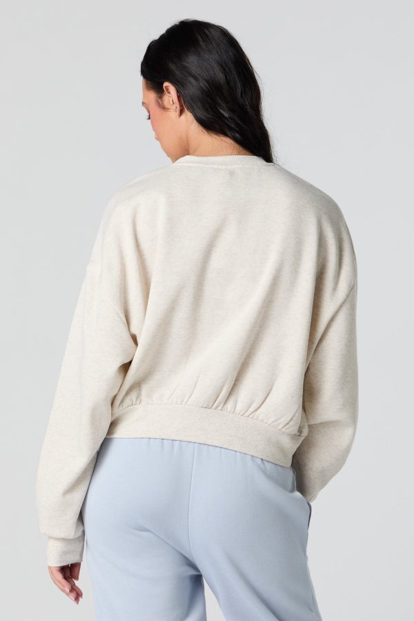 Join the comfort club. This sweatshirt features embroidered front, fleece material, crew neckline, long sleeves, and cropped hem.