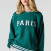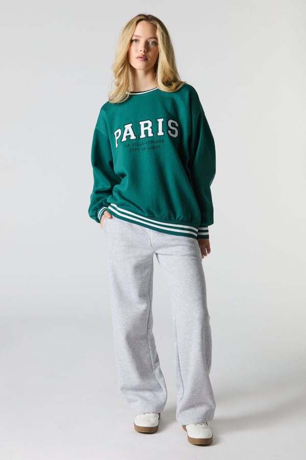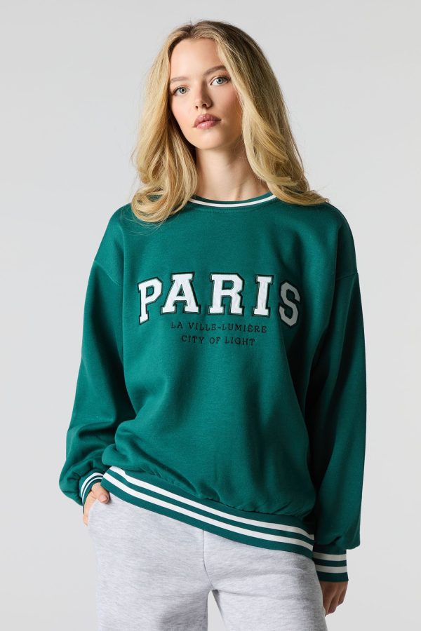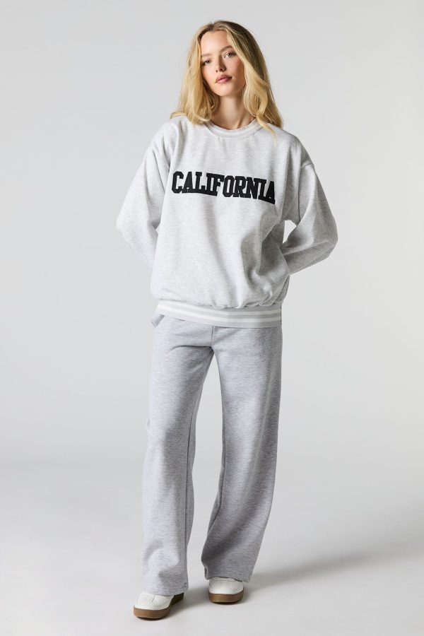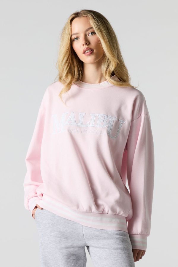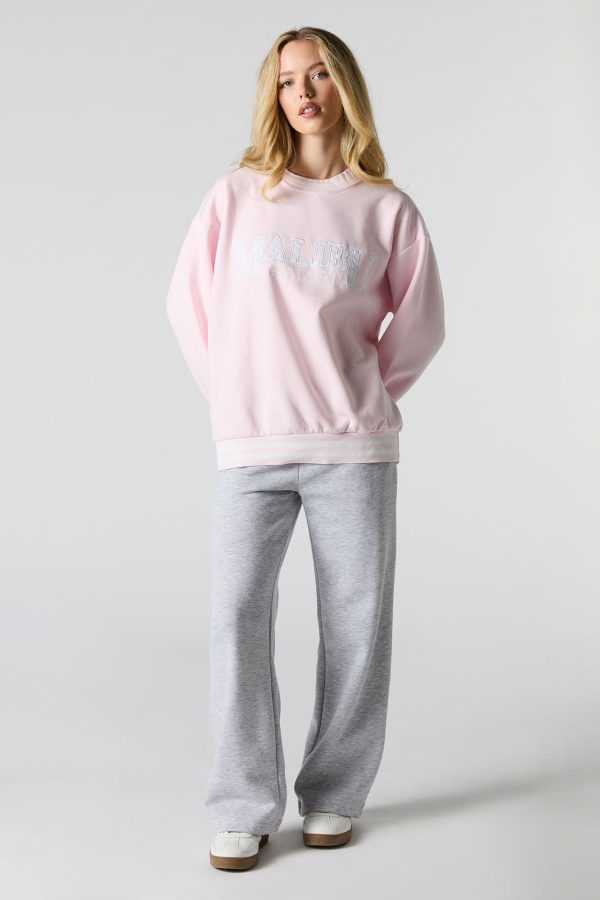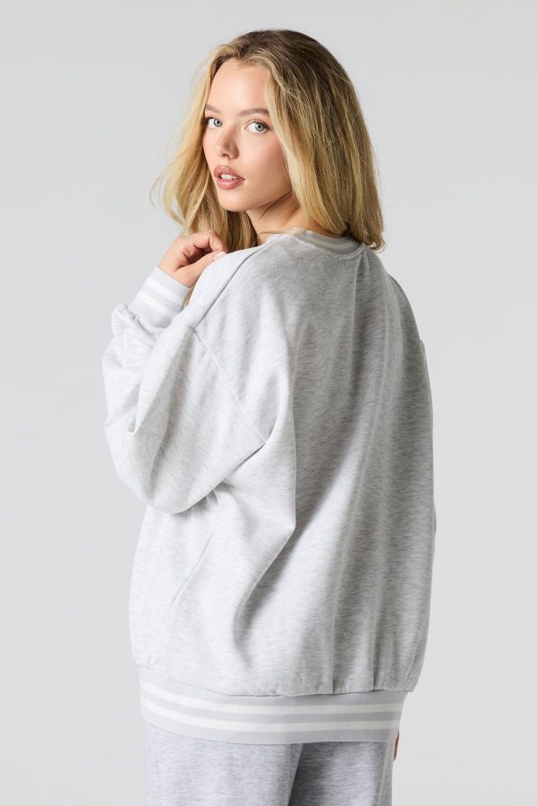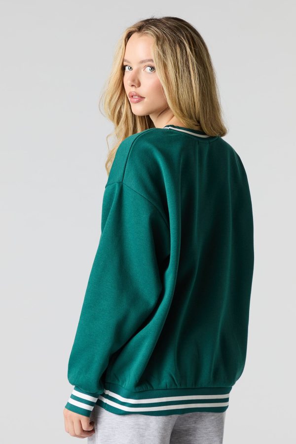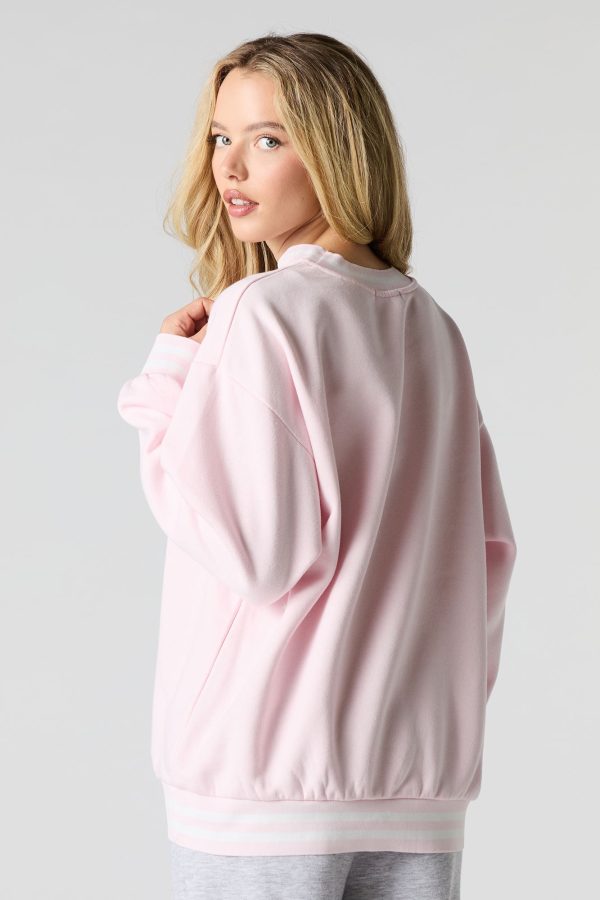 This sweatshirt features oversized fit, fleece material, twill embroidered front, crew neckline, long sleeves, and striped ribbed knit trim.