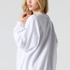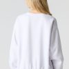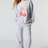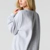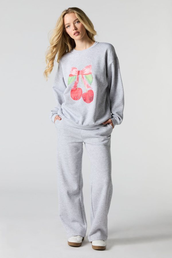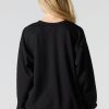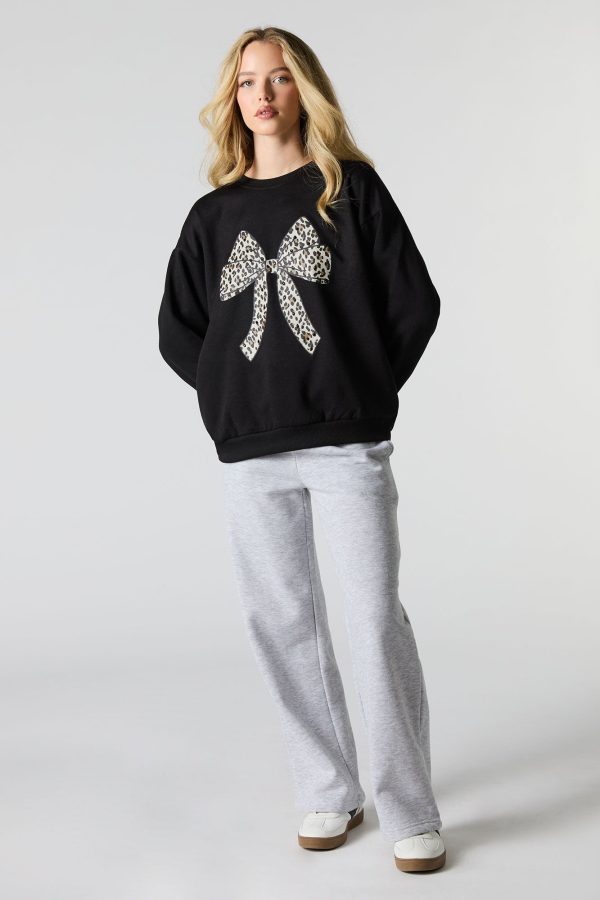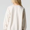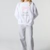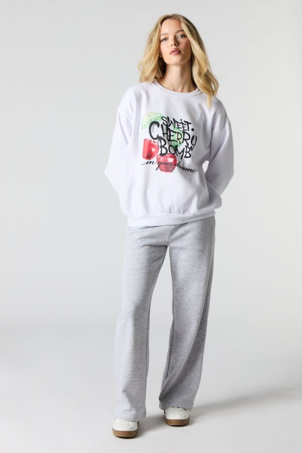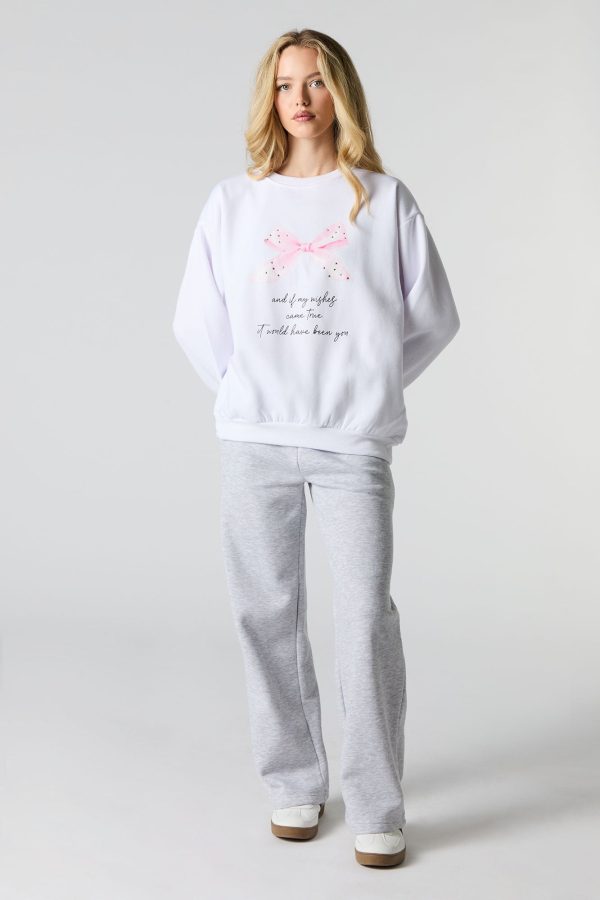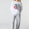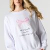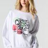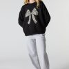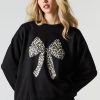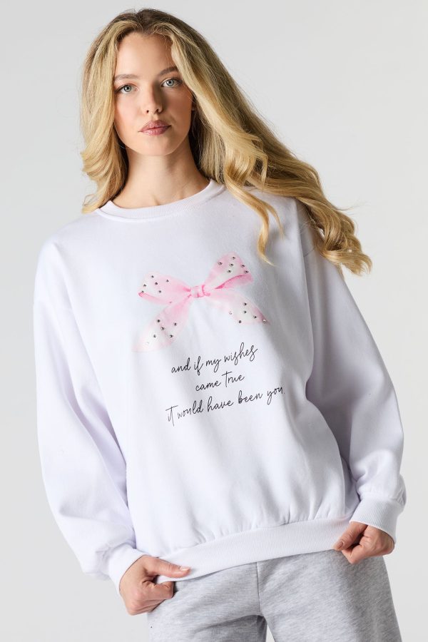 This sweatshirt features oversized fit, fleece material, rhinestone graphic front, crew neckline, long sleeves, and ribbed knit trim.